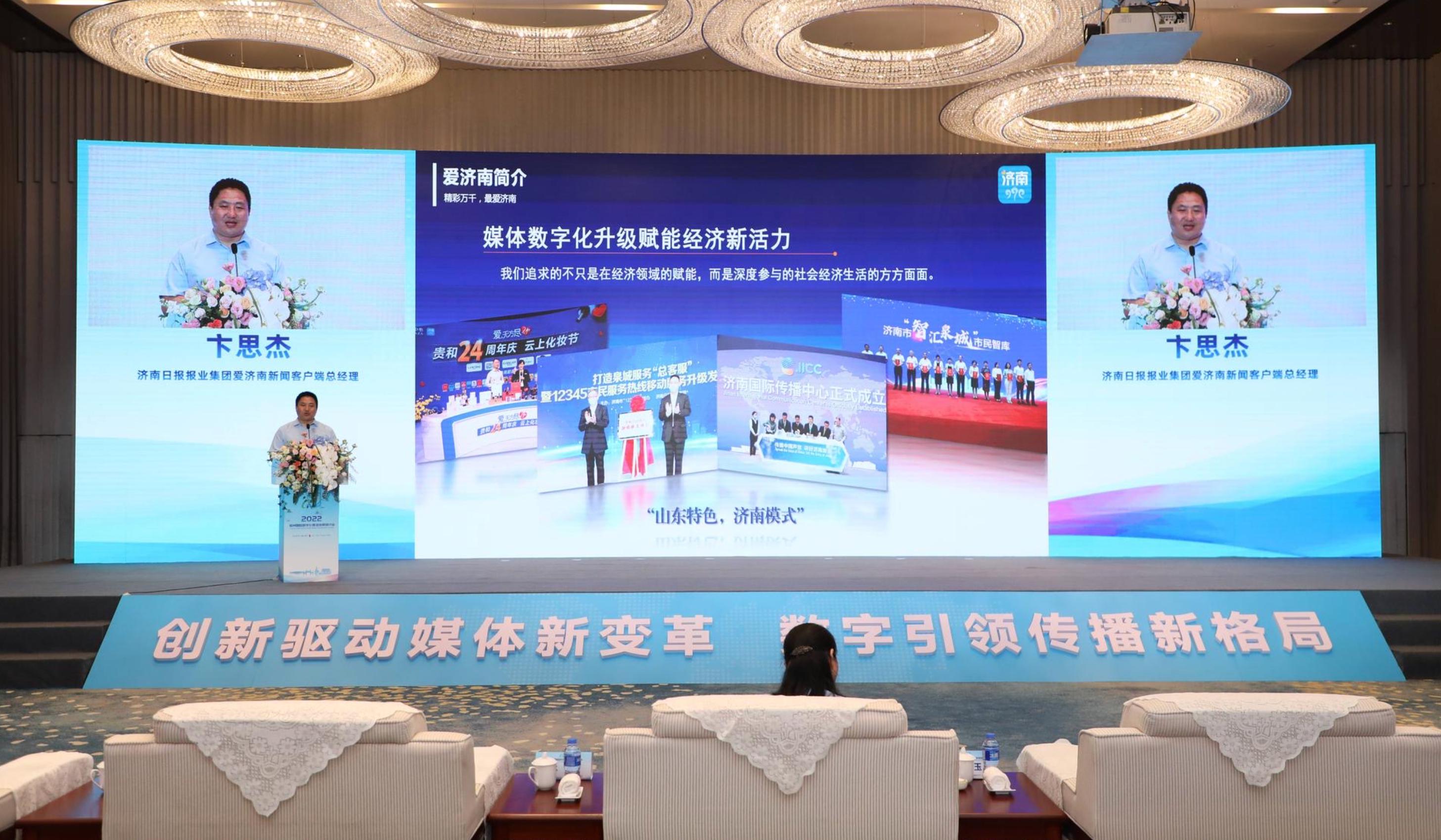 济南日报报业集团爱济南新闻客户端总经理卞思杰分享了爱济南赋能城市发展的探索之路。卞思捷介绍,在推进媒体融合向纵深发展中,爱济南将“两个中心”(济南融媒体中心、济南市新时代文明实践中心)一体化建设,探索形成了以“媒体融合+文明涵养+社会治理”的媒体融合路径。