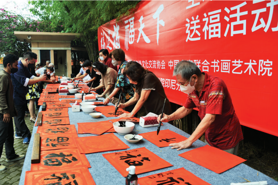 活动以“福”文化为主题,向世界传播中国福文化,通过笔墨在红纸上用寓意吉祥的“福”字和以春联的形式,写下对美好生活的期盼与祝愿。本次活动在营造欢乐喜庆氛围同时,也为印尼书家之间增进交流和相互学习提供了机会,充分展现出印尼华人们喜迎佳节的良好祈愿。在新春佳节即将来临之际,众多书法家现场挥毫泼墨,墨香满满,福字送福,气氛欢悦,在传播中华优秀传统文化的同时,也提前为国际友人送上了中国农历新年的祝福。